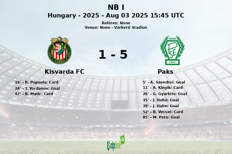 Várkerti Stadion, Hungría – En un encuentro vibrante y lleno de acción correspondiente a la segunda ronda de la temporada regular de la NB I, el Paks demostró una contundencia ofensiva impresionante para superar al Kisvarda FC con un marcador final de 5 a 1.
