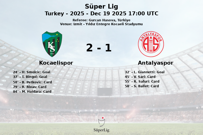 En un encuentro disputado en el Yıldız Entegre Kocaeli Stadyumu de Izmit, Kocaelispor y Antalyaspor empataron en un partido lleno de acción perteneciente a la jornada 17 de la Süper Lig. El partido, arbitrado por Gurcan Hasova, tuvo una primera mitad electrizante. Kocaelispor se adelantó en el marcador al minuto 24 con un gol de H. Smolcic, tras una jugada sin asistencia. Antalyaspor respondió rápidamente con un gol de L. Giannetti al minuto 32, asistido por R. Safuri. La alegría duró poco para los visitantes, ya que T. Bingol de Kocaelispor volvió a poner a su equipo por delante al minuto 37, con asistencia de K. Linetty.