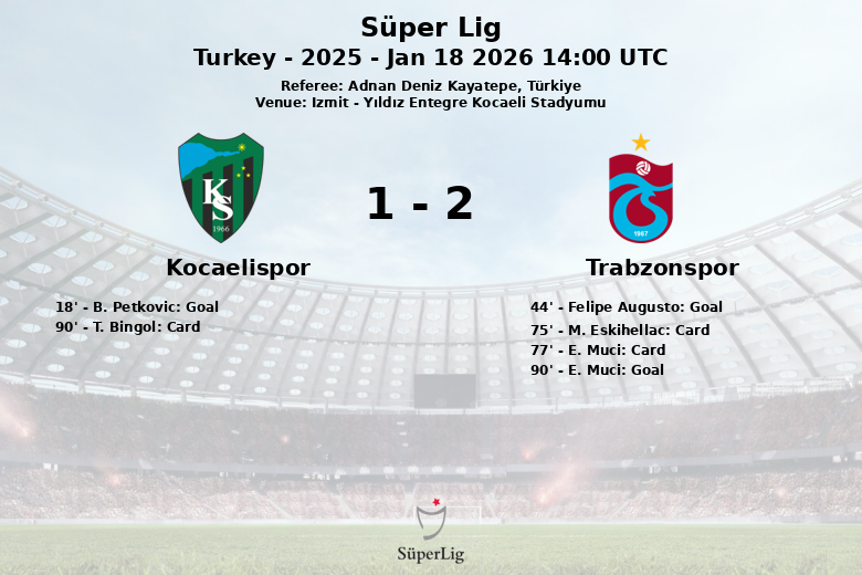 La segunda mitad se mantuvo reñida, con ambos equipos buscando desequilibrar el marcador. La tensión se reflejó en el juego, con un total de 30 faltas cometidas y tres tarjetas amarillas mostradas (una para el Kocaelispor y dos para el Trabzonspor). Cuando parecía que el empate era inevitable, E. Muci del Trabzonspor, asistido por O. Zubkov, marcó el gol de la victoria al minuto 90, sellando el triunfo para su equipo.