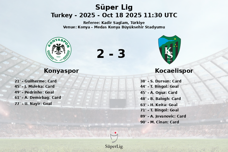 Kocaelispor se adelantó al filo del descanso con un gol de T. Bingol, dando la ventaja a su equipo antes de irse a los vestuarios. Sin embargo, Konyaspor respondió al inicio del segundo tiempo con un penal convertido por Pedrinho, igualando el marcador. La alegría local duró poco, ya que H. Keita volvió a poner en ventaja a Kocaelispor, asistido por K. Linetty. No conformes, Bingol repitió para aumentar la ventaja visitante. Cuando parecía que el partido estaba definido, U. Nayir descontó para Konyaspor, añadiendo emoción a los minutos finales.