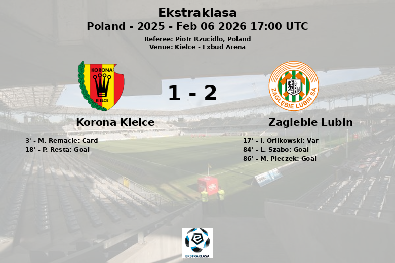 El Zaglebie Lubin buscó la remontada y encontró el empate al minuto 84 con un gol de L. Szabo. Poco después, la fortuna sonrió al equipo visitante cuando M. Pieczek del Korona Kielce marcó un autogol al minuto 86, dándole la ventaja al Zaglebie Lubin.