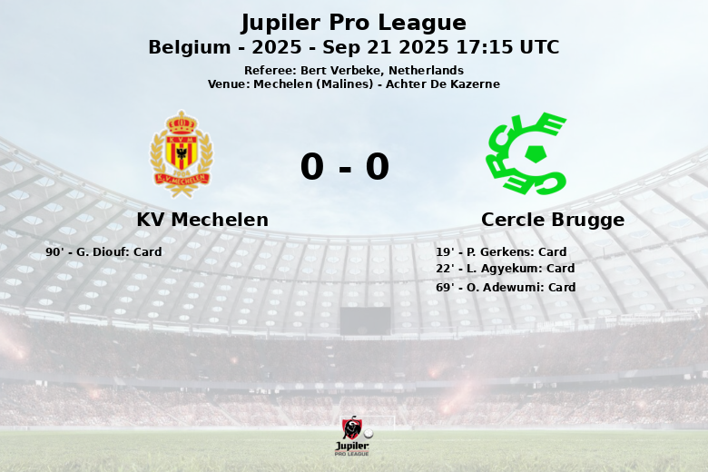 La disciplina fue un factor diferenciador, con Cercle Brugge incurriendo en 17 faltas y recibiendo 3 tarjetas amarillas (P. Gerkens al 19′, L. Agyekum al 22′ y O. Adewumi al 69′). KV Mechelen cometió 6 faltas y solo vio una amonestación a G. Diouf al minuto 90. Ambos equipos generaron 7 saques de esquina.