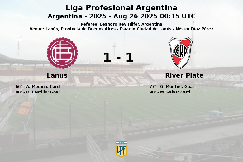 El primer gol del partido llegó en el minuto 77, cuando G. Montiel, tras una asistencia de Giuliano Galoppo, puso en ventaja a River Plate. Cuando parecía que el partido se encaminaba hacia una victoria visitante, R. Castillo igualó el marcador para Lanús en el minuto 90, rescatando un punto valioso.