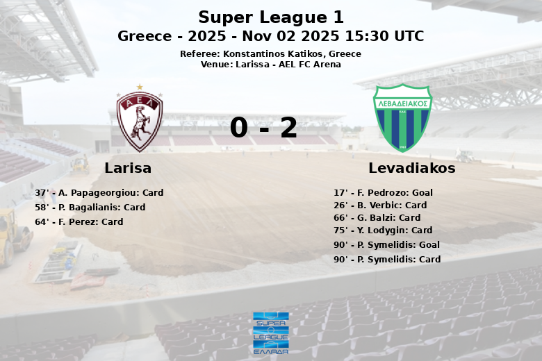 El marcador se abrió en el minuto 17 con un gol de F. Pedrozo para el Levadiakos, tras una jugada sin asistencia. El Larisa, con un 45% de posesión, buscó la igualdad con 15 remates, de los cuales 5 fueron a puerta. Sin embargo, la defensa del Levadiakos se mantuvo sólida. El encuentro fue marcado por un total de 6 tarjetas amarillas, 3 para cada equipo, reflejando la intensidad y las numerosas faltas (14 del Larisa y 12 del Levadiakos). El partido concluyó con un gol de P. Symelidis en el minuto 90, sentenciando el partido a favor del Levadiakos.