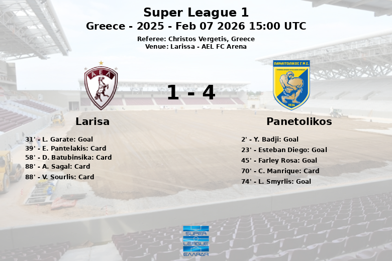 El encuentro arrancó con un gol tempranero de Y. Badji al minuto 2, con asistencia de Farley Rosa, marcando el tono para lo que sería una tarde productiva para el Panetolikos. Esteban Diego amplió la ventaja al minuto 23, y Farley Rosa se sumó a la lista de goleadores justo antes del descanso, al minuto 45, con asistencia de A. Matan. Larisa descontó al minuto 31 gracias a L. Garate, pero no fue suficiente para revertir la situación. L. Smyrlis selló la victoria para el Panetolikos al minuto 74, con asistencia de Y. Badji.