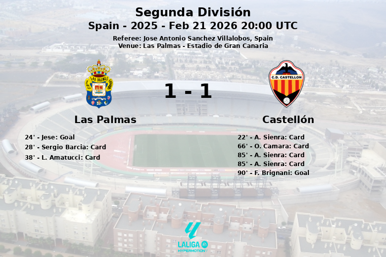 Las Palmas y el Castellón igualaron 1-1 en un encuentro disputado en el Estadio de Gran Canaria, válido por la jornada 27 de la Segunda División. El partido, jugado bajo la atenta mirada del árbitro José Antonio Sánchez Villalobos, estuvo marcado por la intensidad y las constantes interrupciones.