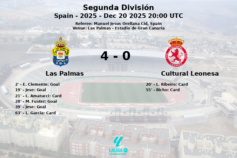 Las Palmas se impuso con autoridad a la Cultural Leonesa en un partido disputado en el Estadio de Gran Canaria. Desde el pitido inicial, el equipo local mostró una gran efectividad ofensiva. E. Clemente abrió el marcador apenas a los 2 minutos, asistido por M. Marmol, estableciendo el tono para el resto del encuentro.