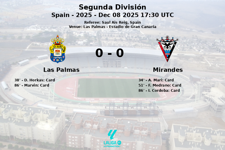 En términos de disparos, el Mirandés superó a Las Palmas con 15 intentos, de los cuales 4 fueron a puerta, mientras que el equipo local realizó 10 tiros, con 3 dirigidos al arco. Ambos equipos cometieron el mismo número de faltas, 11 cada uno. El partido se caracterizó por la intensidad, reflejada en las cuatro tarjetas amarillas mostradas (una para Las Palmas y tres para el Mirandés), además de la tarjeta roja para el jugador de Las Palmas. El encuentro finalizó sin goles, dejando un sabor agridulce en ambos conjuntos.