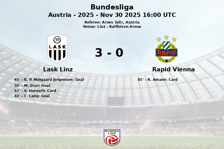 El primer gol llegó justo antes del descanso, en el minuto 45, cuando K. P. Molgaard Jorgensen, asistido por M. Bogarde, abrió el marcador para el LASK Linz. Ya en la segunda mitad, M. Usor amplió la ventaja en el minuto 55, gracias a una precisa asistencia de S. Adeniran. Aunque el Rapid Vienna intentó reaccionar, sus esfuerzos se vieron frustrados por la sólida defensa del LASK Linz. Finalmente, C. Lang sentenció el partido en el minuto 82, nuevamente con asistencia de M. Bogarde.