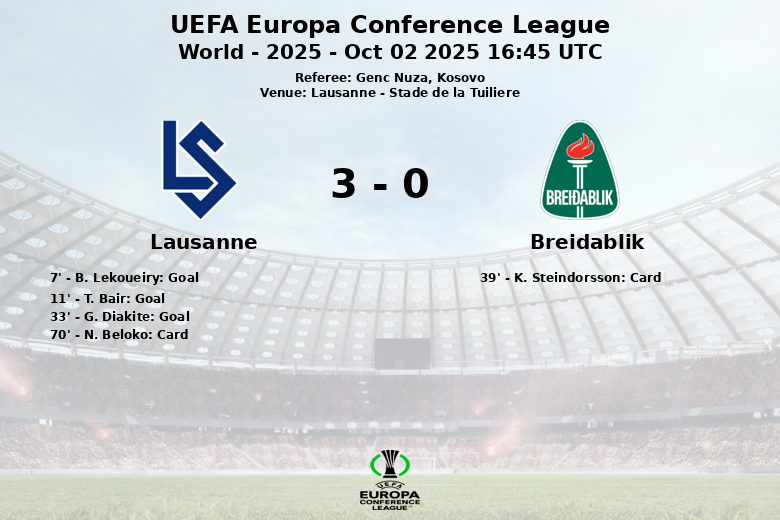 A pesar de los esfuerzos del Breidablik, que intentó responder con 12 tiros (2 a puerta), la defensa del Lausanne se mantuvo sólida. El Breidablik sufrió un golpe anímico al minuto 39, cuando K. Steindorsson recibió una tarjeta amarilla. El Lausanne controló el ritmo del partido hasta el pitido final. Aunque el Breidablik obtuvo 7 tiros de esquina, no fue suficiente para generar peligro real en la portería rival. El partido culminó con un total de 16 tiros para el Lausanne, 8 de ellos a puerta, evidenciando su superioridad ofensiva.