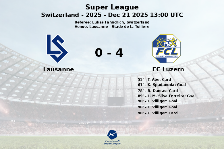 En los minutos finales, el FC Luzern desató una ofensiva imparable. L. M. Silva Ferreira amplió la ventaja en el minuto 89, asistido por K. Spadanuda. Casi de inmediato, L. Villiger anotó dos goles más en el minuto 90, con asistencias de T. Owusu y S. Ottiger respectivamente, sellando la victoria para el FC Luzern. El Lausanne, que había ejecutado 6 córners, no pudo capitalizar sus oportunidades. El partido también vio tarjetas amarillas para T. Abe y R. Dantas del FC Luzern, y una para L. Villiger, pero ninguna tarjeta roja para ambos equipos. El Lausanne cometió 5 faltas, mientras que el FC Luzern cometió 4.