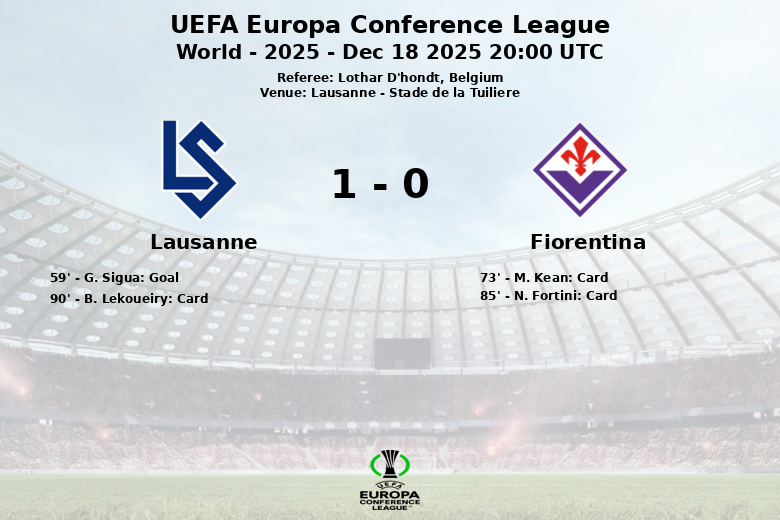 Lausanne derrotó a la Fiorentina en un partido disputado en el Stade de la Tuiliere en Lausanne, Suiza, correspondiente a la fase de grupos de la Europa Conference League. El encuentro, arbitrado por Lothar D’hondt de Bélgica, vio al equipo local imponerse gracias a un gol de G. Sigua en el minuto 59, con asistencia de E. Kana-Biyik.