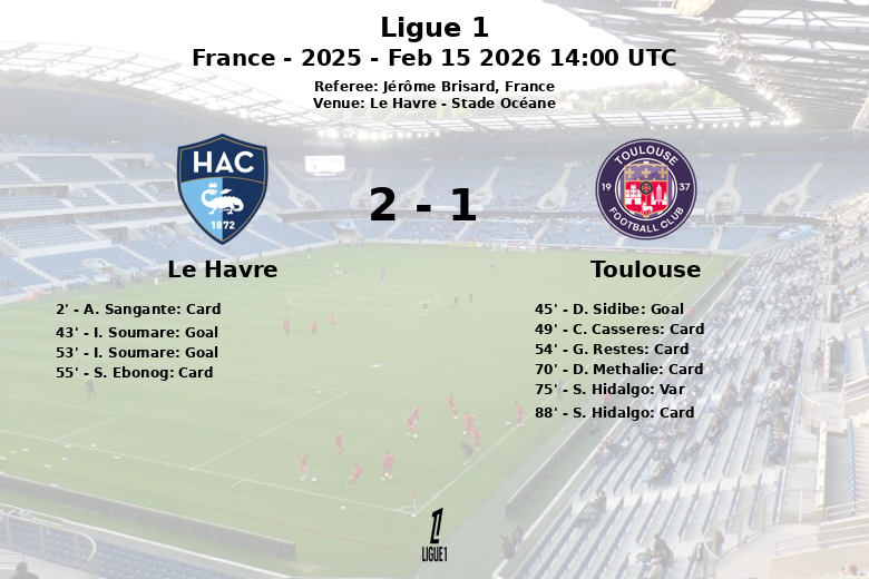 El partido comenzó de manera dramática para Le Havre con la expulsión de A. Sangante al minuto 2. Sin embargo, los locales no se amilanaron y, contra todo pronóstico, I. Soumare abrió el marcador al minuto 43. Toulouse respondió rápidamente justo antes del descanso con un gol de D. Sidibe al minuto 45, igualando el marcador y dejando todo abierto para la segunda mitad.