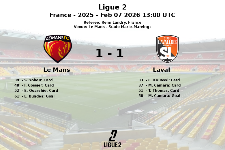 Laval se adelantó en el marcador al minuto 58 gracias a un penal convertido por M. Camara, sin asistencia. Sin embargo, la alegría duró poco para los visitantes, ya que Le Mans respondió rápidamente. Al minuto 61, L. Buades igualó el encuentro con un gol que desató la euforia en las gradas.