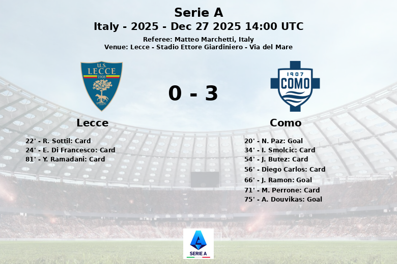 El Como abrió el marcador al minuto 20 con un gol de N. Paz, tras una asistencia de M. Vojvoda. El Lecce sufrió un duro golpe cuando E. Di Francesco recibió una tarjeta roja al minuto 24, dejando a su equipo con diez hombres durante gran parte del encuentro. A pesar de los esfuerzos del Lecce, el Como amplió su ventaja al minuto 66 con un gol de J. Ramon, nuevamente con asistencia de M. Vojvoda. El definitivo 3 a 0 llegó al minuto 75, cortesía de A. Douvikas, asistido por N. Paz.