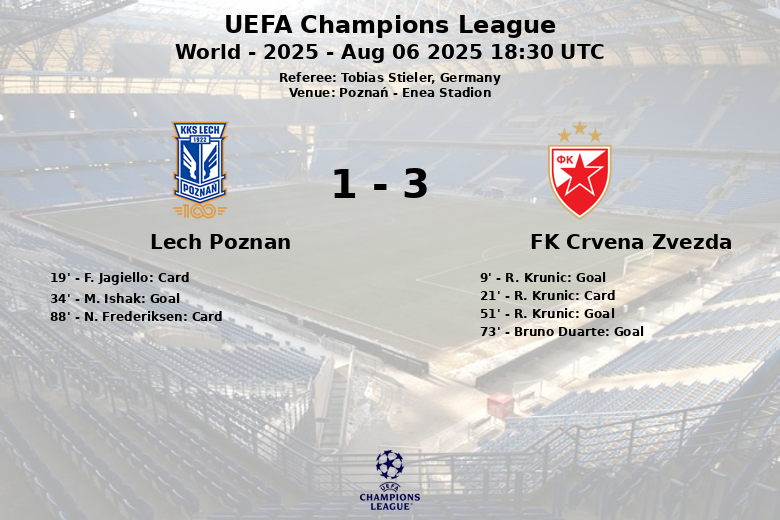 En un encuentro vibrante disputado en el Enea Stadion de Poznań, el FK Crvena Zvezda se impuso al Lech Poznan en un partido correspondiente a la tercera ronda clasificatoria de la UEFA Champions League. El equipo serbio demostró gran efectividad de cara al arco, a pesar de tener una menor posesión del balón (40%) frente al 60% del equipo local.