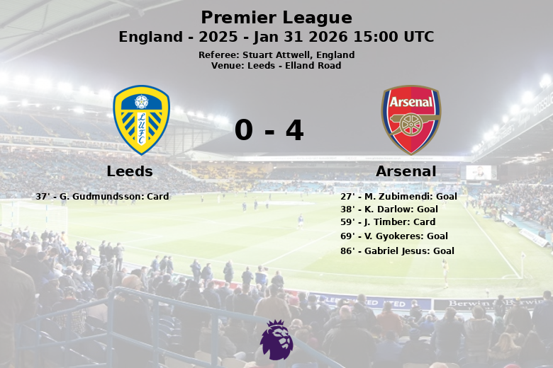 El Arsenal abrió el marcador en el minuto 27 gracias a un gol de M. Zubimendi, tras una excelente asistencia de N. Madueke. A pesar de que el Leeds intentó reaccionar, se vio dificultado por una tarjeta amarilla a G. Gudmundsson en el minuto 37. Poco después, en el 38, la fortuna sonrió al Arsenal con un autogol de K. Darlow, ampliando así la ventaja.