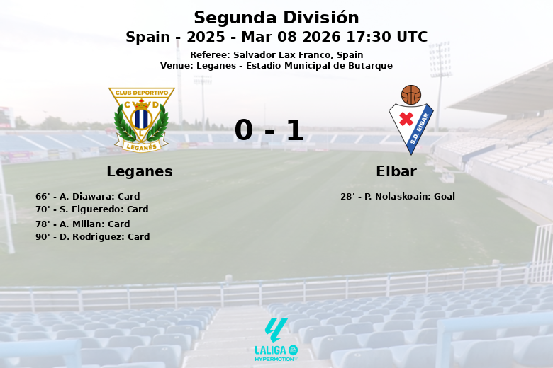 El Eibar, por su parte, aprovechó una de sus escasas oportunidades y defendió con solidez su ventaja. Aunque solo disfrutaron del 37% de la posesión y realizaron 8 tiros (6 a puerta y 1 fuera), la efectividad fue clave para sumar los tres puntos. El Leganés sufrió una tarde de frustración, acumulando 10 corners y 14 faltas, además de cuatro tarjetas amarillas mostradas a A. Diawara, S. Figueredo, A. Millan y D. Rodriguez. El partido, correspondiente a la jornada 29 de la Segunda División española, estuvo marcado por la intensidad y la lucha en el centro del campo, aunque la puntería del Eibar fue decisiva. El arbitraje estuvo a cargo de Salvador Lax Franco.