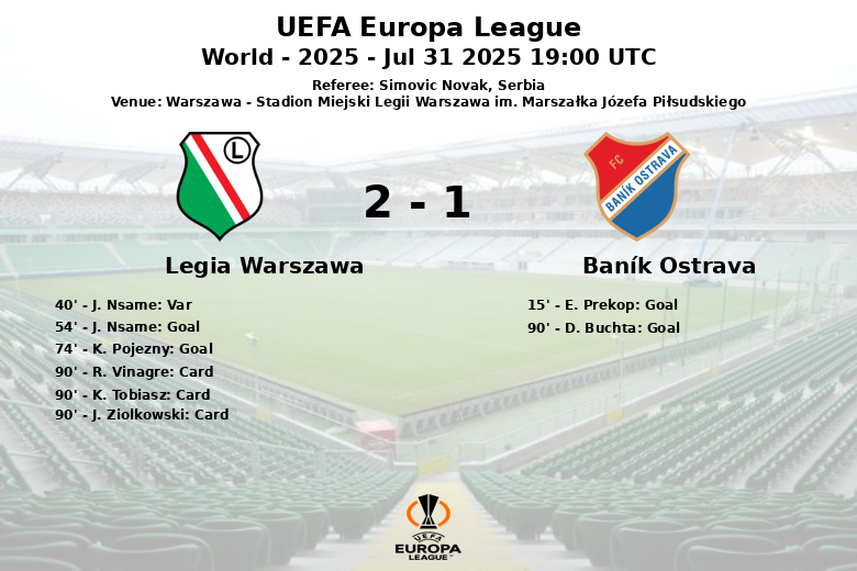 Varsovia fue testigo de un encuentro vibrante entre el Legia Warszawa y el Baník Ostrava, que terminó con la victoria del equipo local. El Baník Ostrava abrió el marcador al minuto 15 con un gol de E. Prekop, asistido por D. Buchta. Sin embargo, el Legia Warszawa no se rindió y luchó por la remontada.