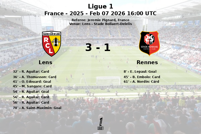 El Rennes comenzó con fuerza, abriendo el marcador en el minuto 8 gracias a un gol de E. Lepaul con asistencia de A. Nordin. Sin embargo, el Lens respondió con determinación. O. Edouard igualó las acciones en el minuto 41, asistido por el propio Aguilar, dejando el marcador empatado al descanso.