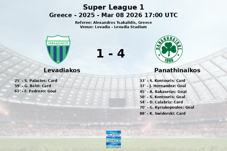 El Levadiakos descontó al minuto 61 con un gol de F. Pedrozo, pero el Panathinaikos respondió rápidamente con un gol de G. Kyriakopoulos al minuto 70, asistido por F. Pellistri, consolidando su ventaja.