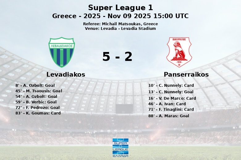 Levadia, Grecia – En un partido disputado en el Levadia Stadium, el Levadiakos se impuso al Panserraikos con un marcador abultado, mostrando un claro dominio en posesión y efectividad de cara al arco. El encuentro, correspondiente a la jornada 10 de la Super League 1, dejó un total de siete goles y cinco tarjetas amarillas.