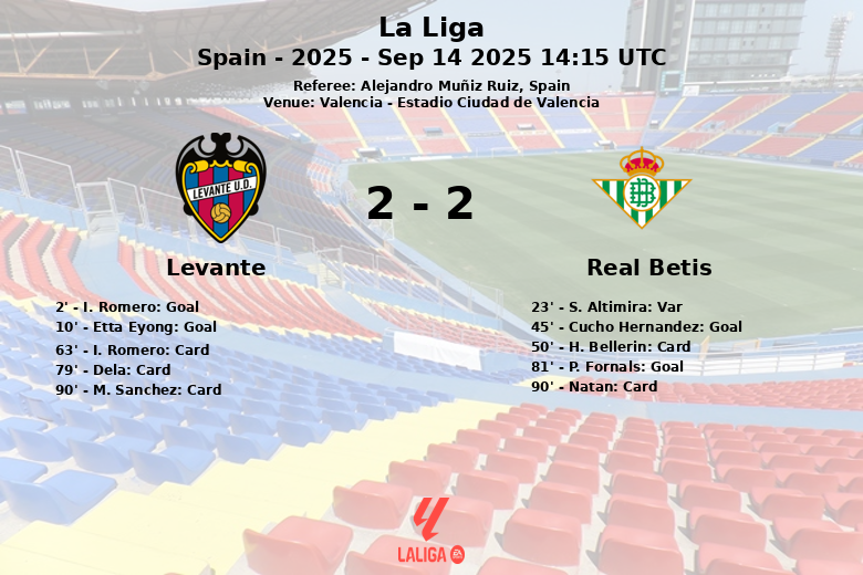 Valencia, España – En un partido cargado de emociones y alternativas, Levante y Real Betis empataron en el Estadio Ciudad de Valencia, correspondiente a la cuarta jornada de La Liga. El encuentro, disputado bajo la atenta mirada del árbitro Alejandro Muñiz Ruiz, dejó constancia de la intensidad del fútbol español.