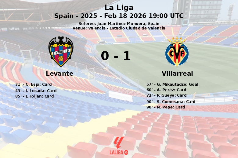 El único gol del partido llegó al minuto 57, obra de G. Mikautadze tras una asistencia de N. Pepe, desatando la alegría en el bando visitante. El partido se caracterizó por un juego intenso, con un total de 33 faltas cometidas entre ambos equipos. El árbitro, Juan Martinez Munuera, mostró un total de siete tarjetas amarillas: tres para jugadores del Levante (C. Espi, I. Losada, J. Toljan) y cuatro para jugadores del Villarreal (A. Perez, P. Gueye, S. Comesana, N. Pepe).