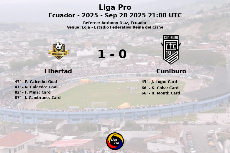 La segunda mitad comenzó con fuerza para Libertad. A los 47 minutos, N. Caicedo, con asistencia de C. Arboleda, logró romper el empate y poner a su equipo en ventaja. A pesar de los intentos de Cuniburo por igualar el marcador, con 7 tiros totales (2 a puerta y 4 fuera), la defensa de Libertad se mantuvo firme. El encuentro se vio interrumpido por varias tarjetas amarillas, dos para cada equipo, lo que refleja la intensidad del juego. Finalmente, Libertad se llevó la victoria gracias a ese único gol. El árbitro Anthony Diaz, de Ecuador, dirigió el encuentro con firmeza.