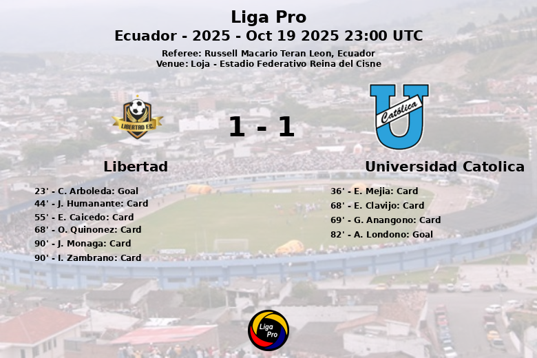 Un partido disputado en el Estadio Federativo Reina del Cisne de Loja, válido por la Liga Pro, finalizó con un empate que dejó sensaciones encontradas para ambos equipos. Libertad se adelantó en el marcador al minuto 23 gracias a un gol de C. Arboleda, asistido por Y. Quinonez. A pesar de tener solo el 31% de la posesión del balón, el equipo local supo aprovechar una de sus llegadas al arco rival.