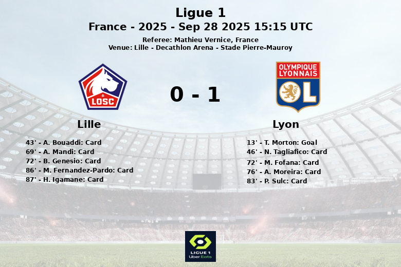 Lille, Francia – En un encuentro disputado en el Decathlon Arena – Stade Pierre-Mauroy, el Lyon se impuso al Lille con un gol tempranero de T. Morton en el minuto 13, asistido por N. Tagliafico. El partido, correspondiente a la sexta jornada de la Ligue 1, estuvo marcado por la intensidad y la alta cantidad de faltas cometidas por ambos equipos, reflejado en la acumulación de tarjetas.