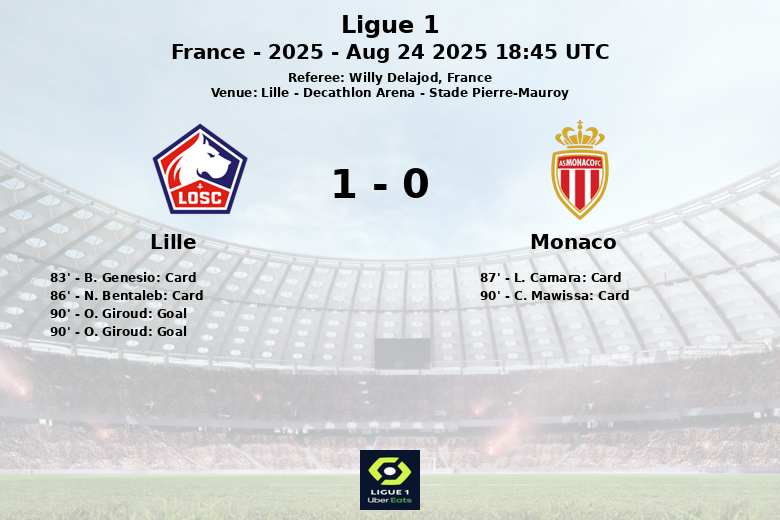 Lille, Francia – En un partido cargado de tensión y emoción hasta el último minuto, Lille y Monaco empataron en el Decathlon Arena – Stade Pierre-Mauroy. El encuentro, correspondiente a la segunda ronda de la Ligue 1 2025, fue arbitrado por Willy Delajod.