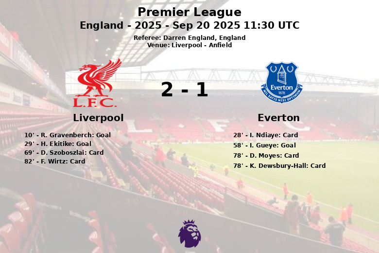 A pesar del control del Liverpool, el Everton logró descontar al minuto 58 con un gol de Idrissa Gueye, asistido por Iliman Ndiaye. Sin embargo, el esfuerzo no fue suficiente para contrarrestar la solidez del Liverpool, que mantuvo la posesión del balón en un 58% y generó 11 tiros, aunque sólo 3 de ellos fueron a puerta. El Everton, por su parte, mostró garra y generó 9 disparos, pero con menor precisión. El partido estuvo marcado por la intensidad, reflejada en las tarjetas amarillas mostradas a jugadores de ambos equipos, incluyendo a Dominik Szoboszlai y Florian Wirtz por el Liverpool, y a Iliman Ndiaye, Dale Moyes, y Kiernan Dewsbury-Hall por el Everton. El árbitro, Darren England, tuvo una labor exigente en un clásico que no decepcionó en emociones. El Liverpool suma tres puntos valiosos en su búsqueda por los primeros puestos de la liga.