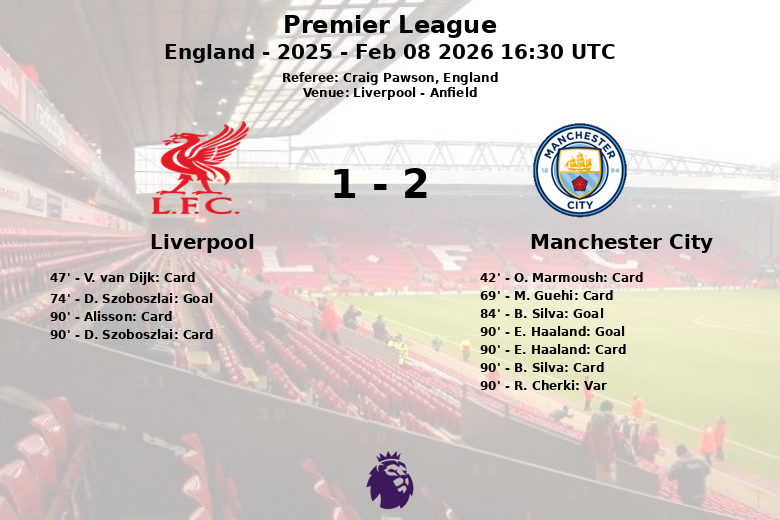 El primer tiempo transcurrió sin goles, pero con algunas tarjetas amarillas: O. Marmoush del Manchester City fue amonestado en el minuto 42 y V. van Dijk del Liverpool en el 47. La segunda mitad trajo consigo la acción. D. Szoboszlai abrió el marcador para el Liverpool en el minuto 74, pero B. Silva igualó para el Manchester City en el minuto 84, asistido por E. Haaland. En el tiempo de descuento, E. Haaland marcó un penal para el City en el minuto 90, generando aún más dramatismo. El mismo Haaland recibió una tarjeta amarilla inmediatamente después. La polémica llegó cuando un gol de R. Cherki para el City fue anulado por el VAR debido a una falta previa. Para añadir más condimento al final del encuentro, D. Szoboszlai del Liverpool recibió una tarjeta roja en el último minuto.