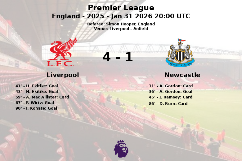 Hugo Ekitike rápidamente respondió para el Liverpool con dos goles consecutivos a los minutos 41 y 43, dando la vuelta al marcador antes del descanso. En la segunda mitad, Florian Wirtz amplió la ventaja al minuto 67, con una asistencia de Mohamed Salah, consolidando el dominio del Liverpool. El golpe final lo dio Ibrahima Konate en el minuto 90, sellando la victoria.