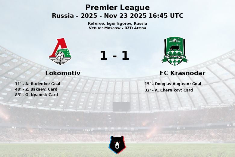 Moscú fue testigo de un emocionante encuentro entre el Lokomotiv y el FC Krasnodar que culminó en un empate. El Lokomotiv se adelantó temprano en el minuto 11 con un gol de A. Rudenko, asistido por D. Prutsev. Sin embargo, el Krasnodar respondió rápidamente en el minuto 15 con un gol de Douglas Augusto.