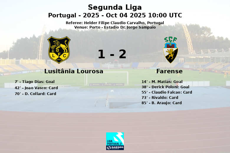 Porto, Portugal – En un disputado partido de la jornada 7 de la Segunda Liga portuguesa, el Farense se alzó con la victoria en el Estadio Dr. Jorge Sampaio frente al Lusitânia Lourosa. El encuentro, arbitrado por Helder Filipe Claudio Carvalho, estuvo marcado por la intensidad y las ocasiones de gol.