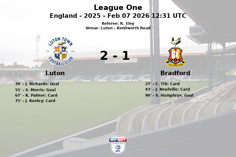 El partido comenzó con intensidad, reflejada en la temprana tarjeta amarilla para C. Tilt de Bradford en el minuto 27. Luton abrió el marcador en el minuto 39 con un gol de J. Richards, asistido por G. Kodua. Bradford intentó reaccionar, pero J. Neufville recibió otra tarjeta amarilla para los visitantes justo antes del descanso.
