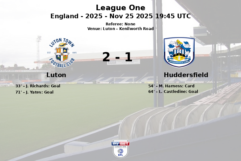J. Richards abrió el marcador para el Luton al minuto 33, dando la ventaja a su equipo. En la segunda mitad, el Huddersfield igualó el marcador al minuto 64 con un gol de L. Castledine. Sin embargo, J. Yates aseguró la victoria para el Luton al minuto 71 con un gol asistido por L. Fanne.