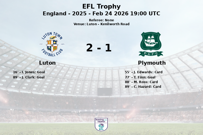 El Luton abrió el marcador temprano, en el minuto 16, con un gol de I. Jones, asistido por J. Richards. El Plymouth buscó la remontada, pero se encontró con una defensa sólida. No fue hasta el minuto 77 que T. Finn logró igualar el marcador para el Plymouth, con una asistencia de R. Curtis, inyectando nueva vida al partido.