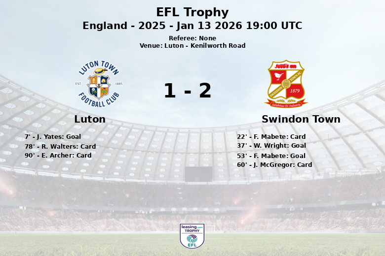 Luton, Inglaterra – En un partido disputado en el Kenilworth Road, el Swindon Town se impuso al Luton en los octavos de final del EFL Trophy. A pesar de un dominio abrumador en la posesión (69%), el Luton no logró capitalizar su ventaja. El partido comenzó con un gol tempranero de J. Yates de penalti para el Luton en el minuto 7. Sin embargo, el Swindon Town reaccionó con fuerza. W. Wright empató el partido en el minuto 37, asistido por M. Olakigbe. En la segunda mitad, F. Mabete puso por delante al Swindon Town en el minuto 53. El Luton, a pesar de acumular 15 tiros (4 a puerta) y 13 corners, no pudo encontrar el camino al gol y terminó cediendo la victoria al Swindon Town. El partido también estuvo marcado por las tarjetas amarillas, con dos para el Swindon Town y dos para el Luton. El Swindon Town avanzó a la siguiente ronda tras un partido de gran solidez defensiva y efectividad en el ataque. El resultado final fue Luton 1 Swindon Town 2.