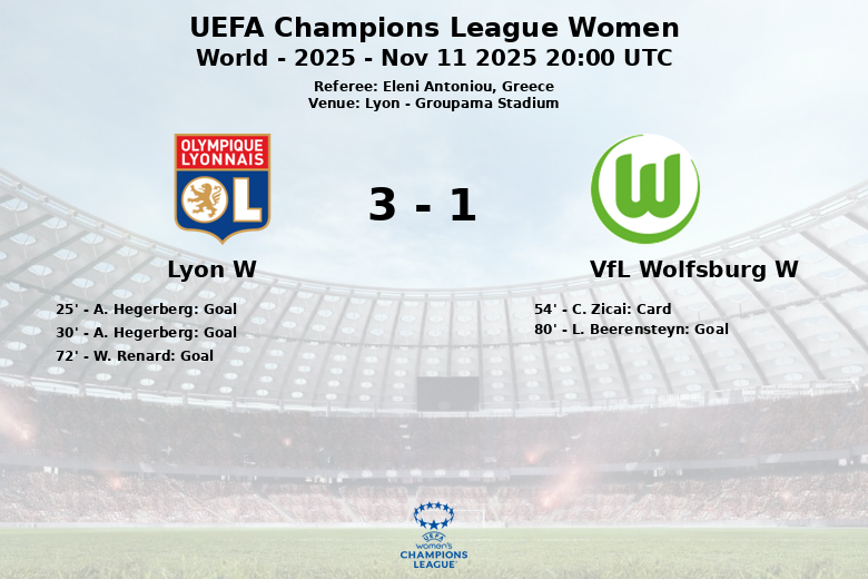 Lyon, Francia – En un encuentro disputado en el Groupama Stadium, el Lyon Femenino demostró su superioridad ante el VfL Wolfsburgo Femenino, imponiéndose con un marcador de tres a uno. El partido, correspondiente a la fase de grupos de la UEFA Champions League Femenina, edición 2025, fue arbitrado por Eleni Antoniou de Grecia.