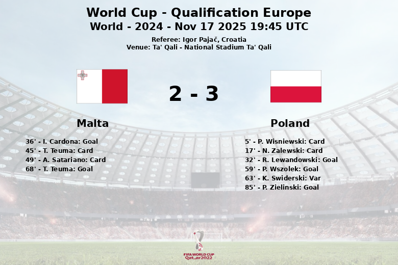 Ta’ Qali, Malta – En un encuentro correspondiente a la fase de clasificación para la Copa del Mundo, Polonia se impuso a Malta en el National Stadium Ta’ Qali. El partido, arbitrado por el croata Igor Pajač, estuvo marcado por las alternativas en el marcador y las tarjetas mostradas.