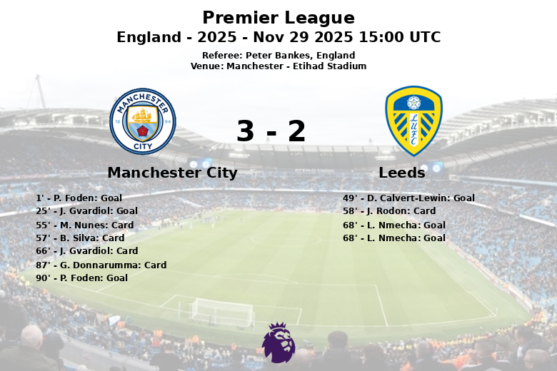 Manchester, Inglaterra – El Manchester City logró una victoria reñida en casa frente al Leeds United en un partido vibrante que mantuvo a los aficionados al borde de sus asientos hasta el último minuto. El encuentro, disputado en el Etihad Stadium bajo la atenta mirada del árbitro Peter Bankes, culminó con un marcador que reflejó la intensidad y el esfuerzo de ambos equipos.