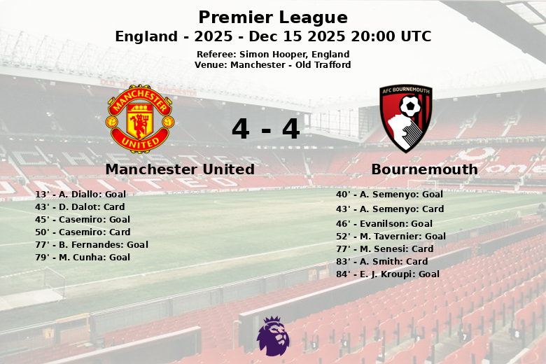 El Bournemouth tomó la delantera con un gol de M. Tavernier al minuto 52. El Manchester United no se rindió y B. Fernandes igualó el marcador al minuto 77. Un gol de M. Cunha al minuto 79 volvió a dar la ventaja al equipo local, pero E. J. Kroupi del Bournemouth cerró el marcador al minuto 84, dejando el resultado final en un empate con muchos goles.
