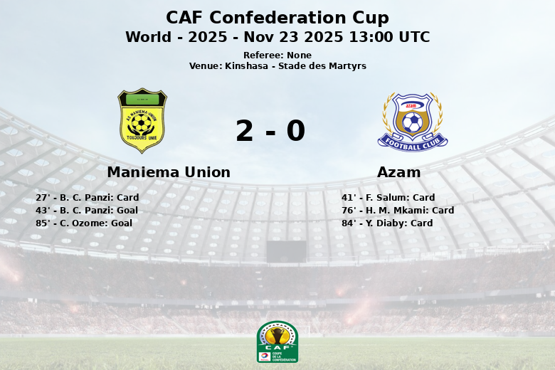 Kinshasa, República Democrática del Congo – En un encuentro disputado en el Stade des Martyrs, el Maniema Union de la República Democrática del Congo se impuso con autoridad al Azam de Tanzania con un marcador de 2 a 0. A pesar de una posesión del balón favorable al Azam (65% frente al 35% del Maniema Union), el equipo local supo capitalizar sus oportunidades.