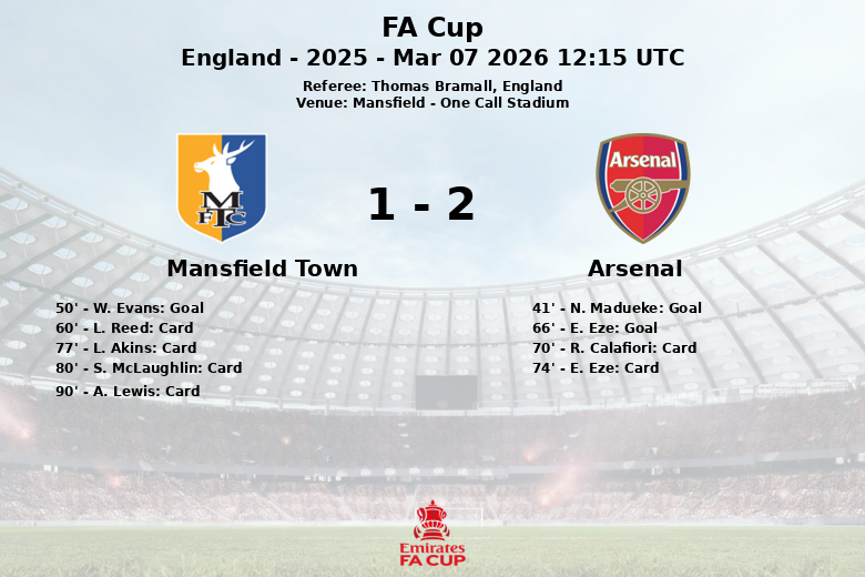El Arsenal abrió el marcador al minuto 41 con un gol de N. Madueke, asistido por G. Martinelli, llevando la ventaja al descanso. Sin embargo, el Mansfield Town respondió al inicio del segundo tiempo, al minuto 50, con un gol de W. Evans. El partido se mantuvo parejo hasta que E. Eze del Arsenal, con asistencia de C. Norgaard, anotó al minuto 66, dándole la ventaja final al equipo londinense.