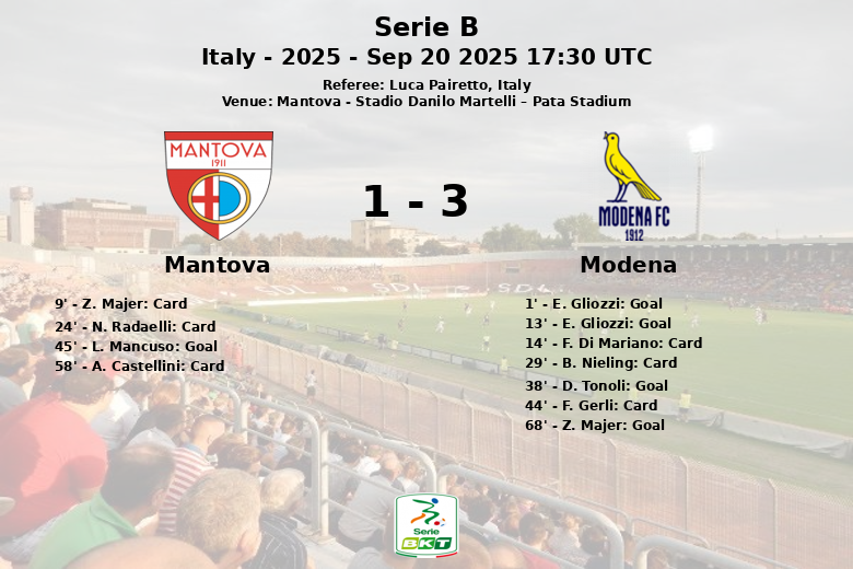 El Modena tomó la delantera temprano, con un gol de E. Gliozzi en el primer minuto, asistido por F. Zampano. La alegría no duraría mucho para el Mantova, que vio a Z. Majer recibir una tarjeta amarilla en el minuto 9. En el minuto 13, Gliozzi tuvo la oportunidad de ampliar la ventaja mediante un penal, pero falló. Poco después, F. Di Mariano vio la tarjeta amarilla en el minuto 14.
