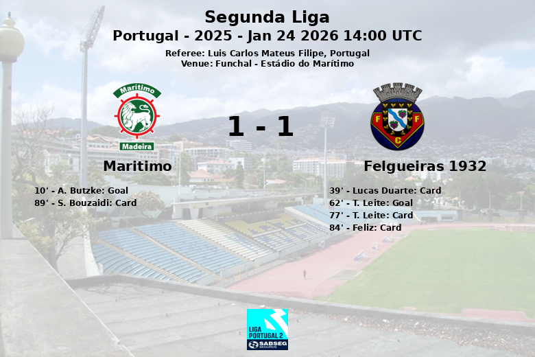 El Marítimo tomó la delantera temprano, al minuto 10, gracias a un gol de A. Butzke. Sin embargo, la alegría local se vio atenuada en el segundo tiempo, cuando T. Leite igualó para el Felgueiras 1932 al minuto 62.