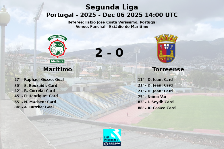Funchal, Portugal – En un encuentro disputado en el Estádio do Marítimo, el Marítimo se llevó la victoria ante el Torreense con un marcador de 2-0 en un partido marcado por la intensidad y las tarjetas. El encuentro, correspondiente a la jornada 13 de la Segunda Liga portuguesa, estuvo caracterizado por un alto número de amonestaciones y una expulsión temprana.